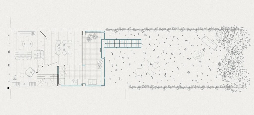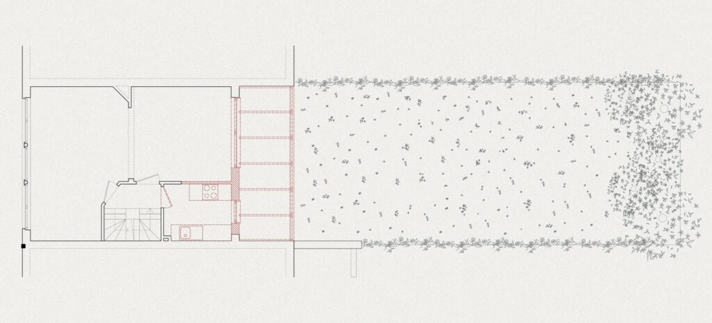 KAM, connecte l’espace extérieur à l’espace de vie [visuellement & physiquement]. KAM, décloisonne les espaces pour remettre au coeur du foyer l’activité de cuisiner. KAM, s’adapte à l’existant afin de créer la nouvelle extension [Trace de l’ancienne terrasse].